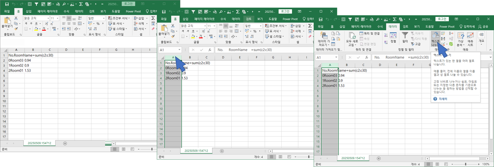 (3) 메뉴에서 '데이터' 탭을 선택한 후, '텍스트 나누기' 명령을 실행합니다.